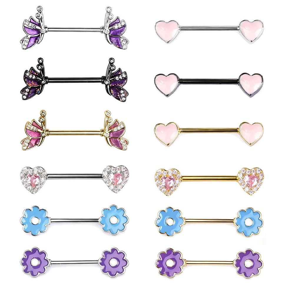 Кольца для сосков в форме штанги с латунной эмалью и фиолетовым цветком,со штифтами из нержавеющей стали 316L,золотые