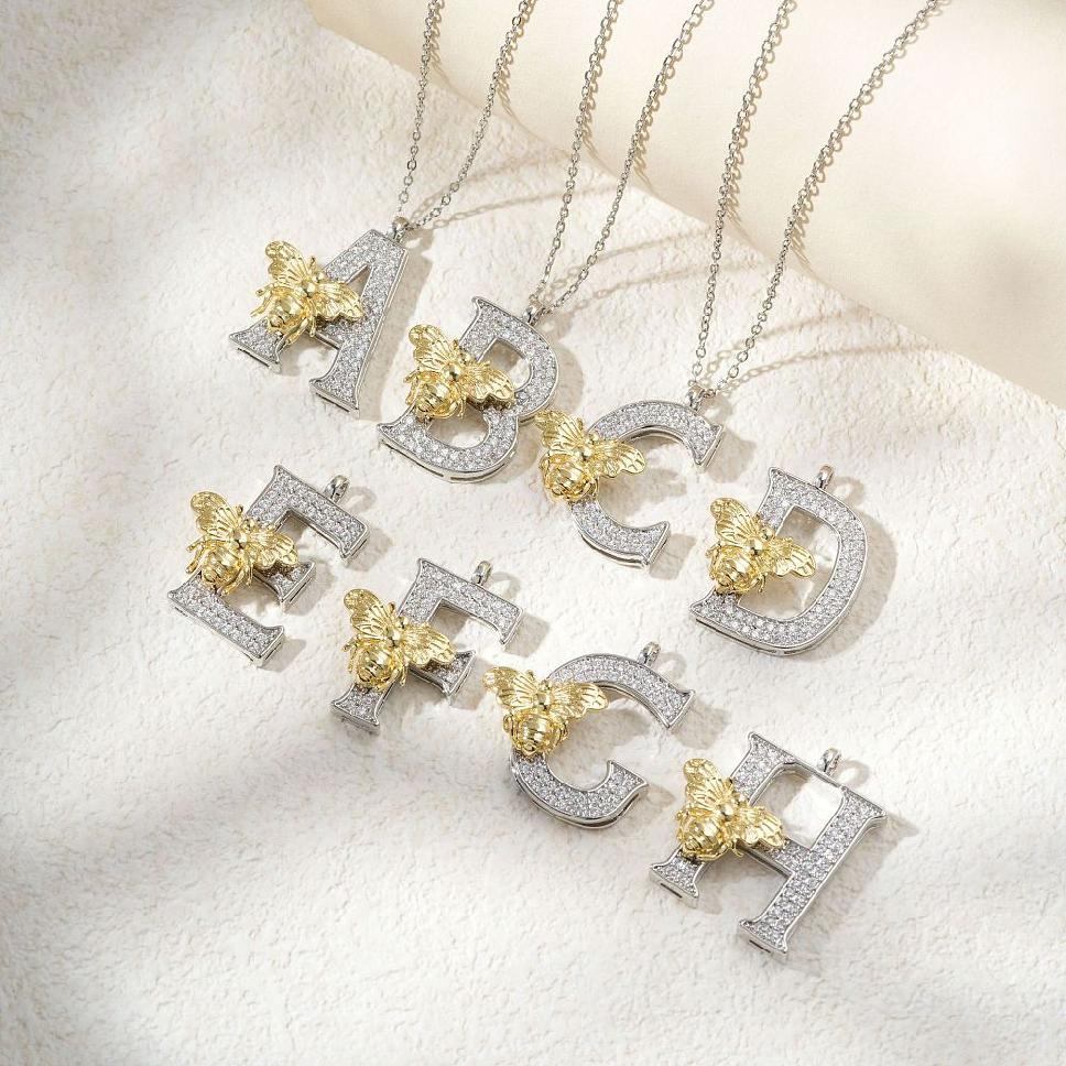 Подвеска в виде пчелы с микропаве из прозрачного кубического циркония в виде микрофибры, латунная, с инициалами.,платиной и золотом,буква a